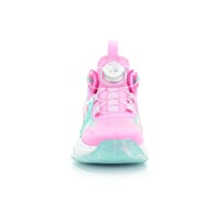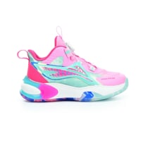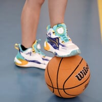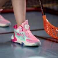 Kindersportschuhe JUNIOR BASKETBALL mit innovativer Befestigungsradtechnologie mit Seil anstelle klassischer Schnürsenkel. Das Rad erleichtert das An- und Ausziehen, spart Zeit und Mühe und hält Ihre Füße an Ort und Stelle, wodurch das Problem loser Schnürsenkel beseitigt wird und eine bessere Stabilität und Unterstützung bei einer Vielzahl von sportlichen Aktivitäten gewährleistet wird. Dank des einzigartigen Designs des erhöhten, verstärkten Schlupfabsatzes sind die Schuhe so konzipiert, dass sie ohne Zuhilfenahme der Hände leicht anzuziehen sind.